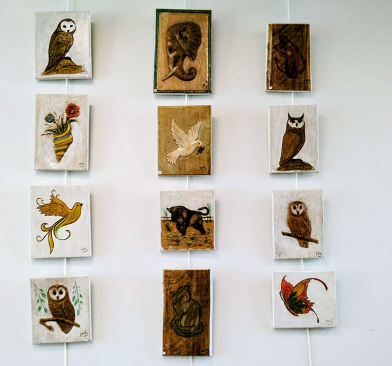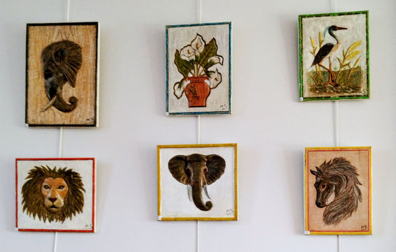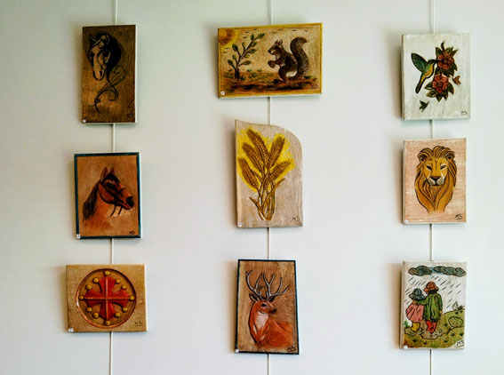 Après le décrochage de l'expo "pierres-visages", fort intéressante de M Jean-Pierre Allano, voici l'accrochage des oeuvres de M. Manuel Somoza, de Rodez. Nous voici dans un contexte très différent, avec ses panneaux de bois sculptés, gravés, rehaussés de pastels. Un art , les "bas-reliefs", qui ont été appréciés à travers l'Histoire. Manuel nous présente des oeuvres sympathiques et un peu naïves, qui sont à la mode, et qui peuvent apporter un vrai peps à la décoration de vos intérieurs.